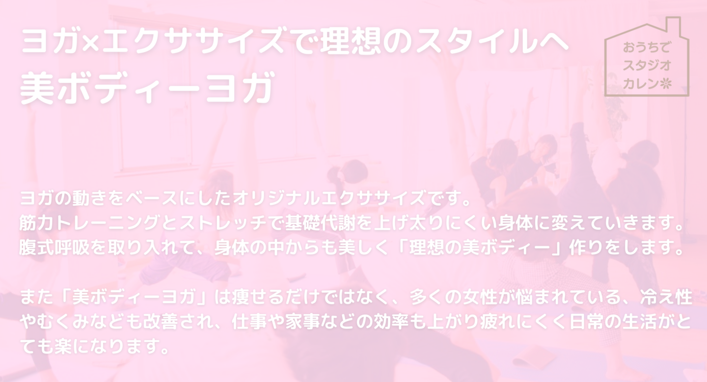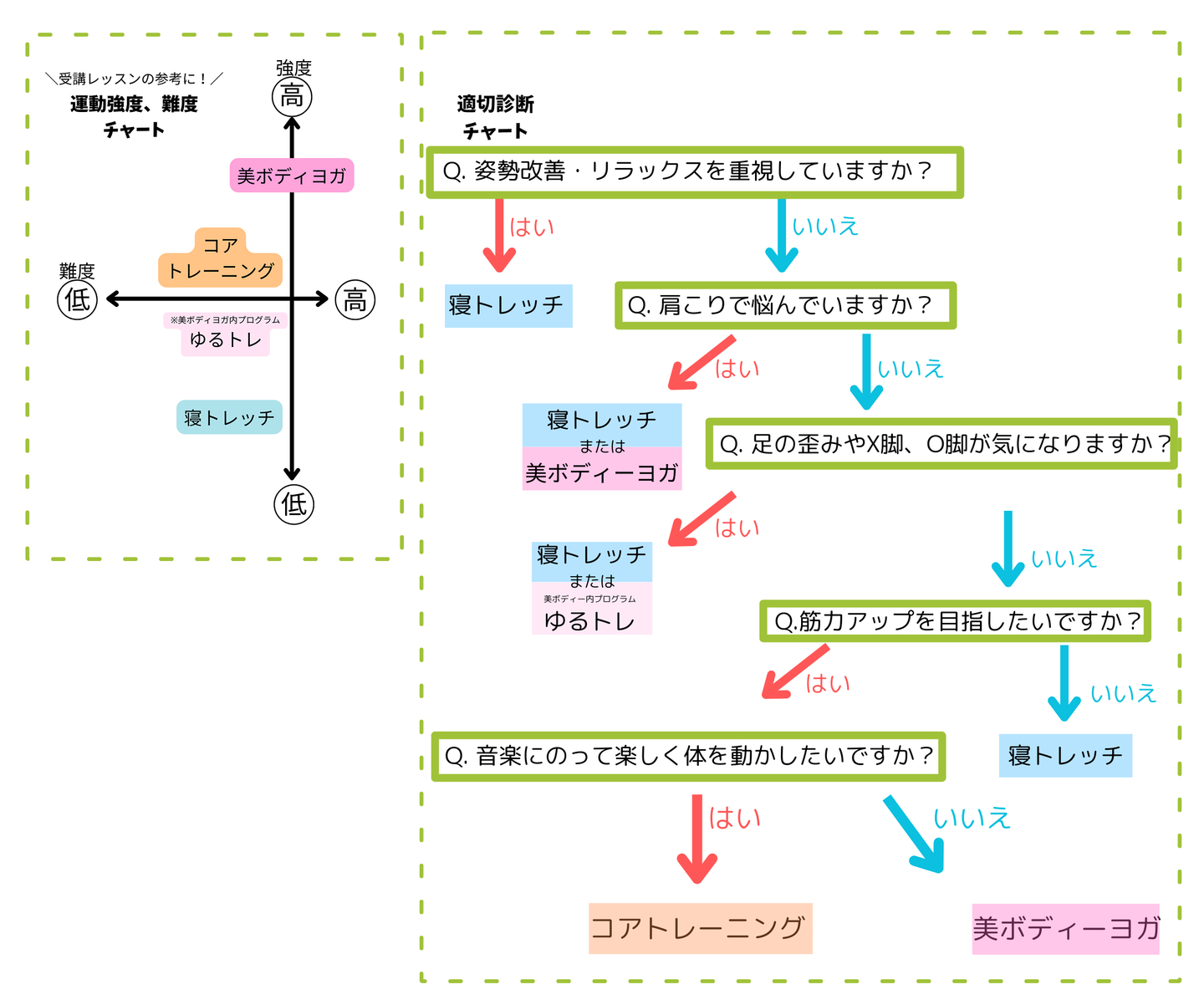 プログラム一覧 寝トレッチ® 美ボディーヨガ コアトレーニング プライベート・出張レッスン 美ボディーヨガ・コアトレーニングはご希望があればオンラインレッスンを行っています。ご希望の方やご質問はこちらからどうぞ。※定員3名とさせていただきます。※コアトレーニングは運動グッズを購入いただく必要があります。 美ボディーヨガ・コアトレーニングはご希望があればオンラインレッスンを行っています。ご希望の方やご質問はこちらからどうぞ。※定員3名とさせていただきます。※コアトレーニングは運動グッズを購入いただく必要があります。 おすすめのプログラム診断&チャート おすすめのプログラム診断&チャート